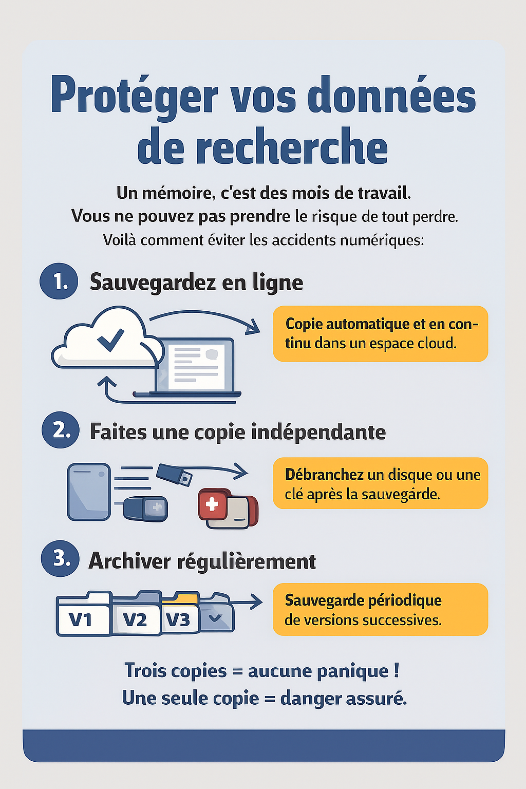 Si vos données disparaissent, vous ne pouvez plus analyser, vous ne pouvez plus justifier vos résultats, vous ne pouvez plus rédiger le mémoire / la thèse et vous ne pouvez plus soutenir. Il ne s’agit pas « juste d’un fichier perdu », mais de mois de travail très difficiles, voire impossibles à refaire.